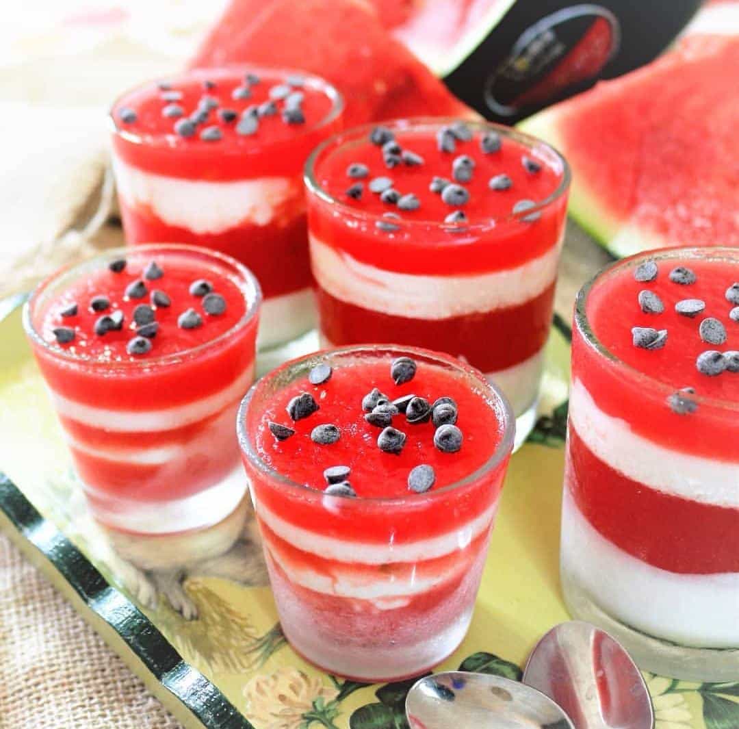 Prendete l’anguria, tagliatela a metà, tagliatene una fetta ed eliminate la buccia. Tagliate la polpa a cubetti e frullateli in un mixer. Otterrete una purea da filtrare per eliminare i semi. Scaldate la purea in un pentolino, scioglietevi l’altra dose di gelatina e mescolate per bene il tutto. Togliete dal frigo i bicchierini con il primo strato di yogurt e aggiungete il secondo strato di purea gelatinosa di anguria. Livellate bene e mettete di nuovo in frigo per mezz’ora. Trascorso il tempo prelevate dal frigo e mettete nei bicchierini un altro strato di yogurt. Rimettete in frigo per mezz’ora, prelevate e mettete nei bicchierini l’altro strato di anguria. Mettete infine ancora in frigo per mezz’ora quindi prelevate i bicchierini e decorateli in ultimo con delle gocce di cioccolato fondente, che sembreranno i semini dell’anguria. Servite i bicchierini yogurt e anguria offrendoli ai vostri ospiti su un vassoio.